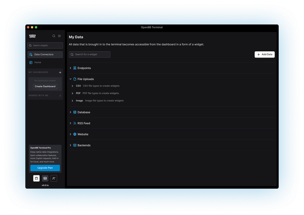Retrieve financial data, integrate proprietary research, and upload historical CSV files.